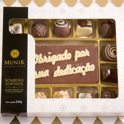 "Caixa de bombons sortidos c/placa de chocolate escrito ""obrigado por sua dedicação"" - 230g"