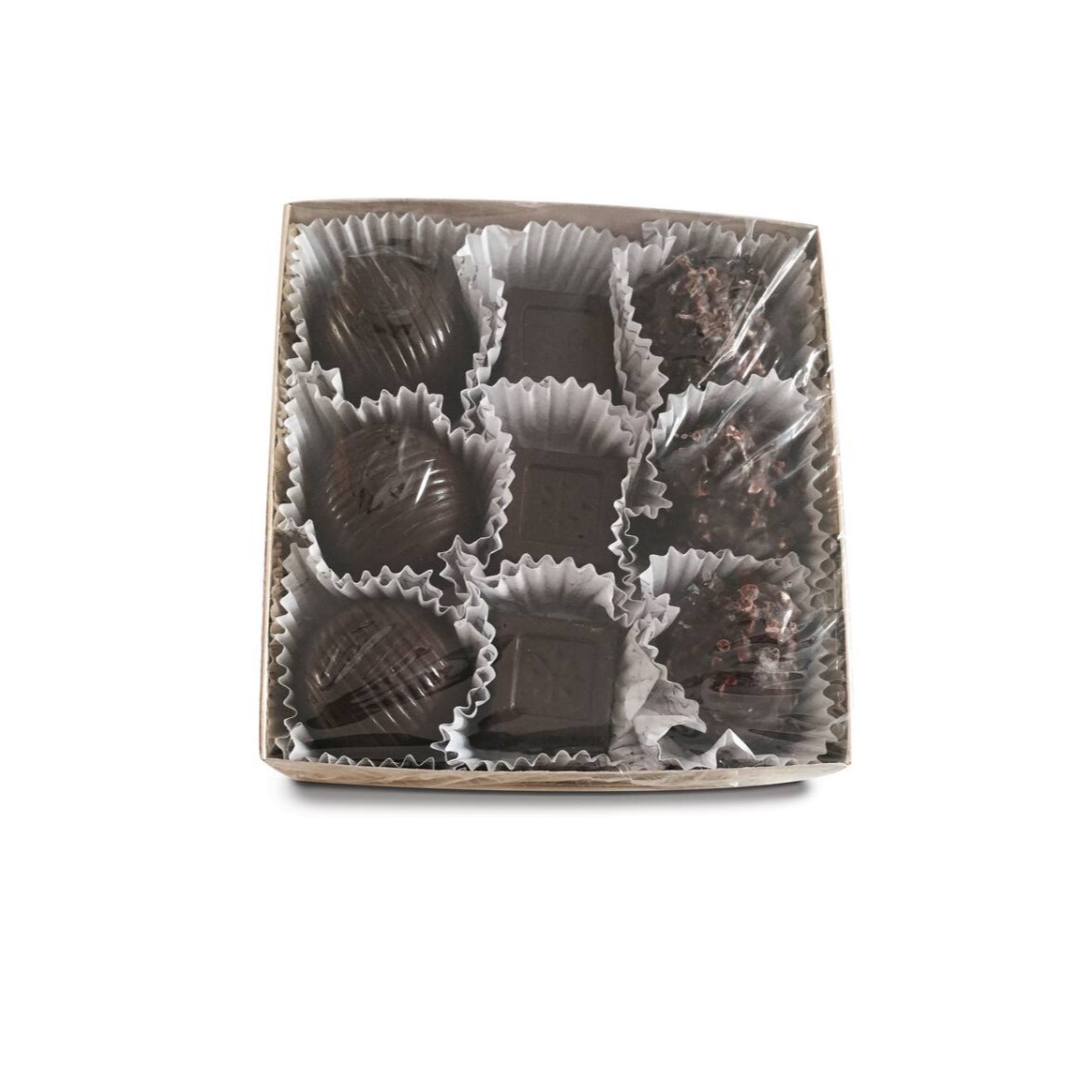 Caixa com 9 bombons sortidos de chocolate meio amargo (50%) com baixo teor de lactose. 100g