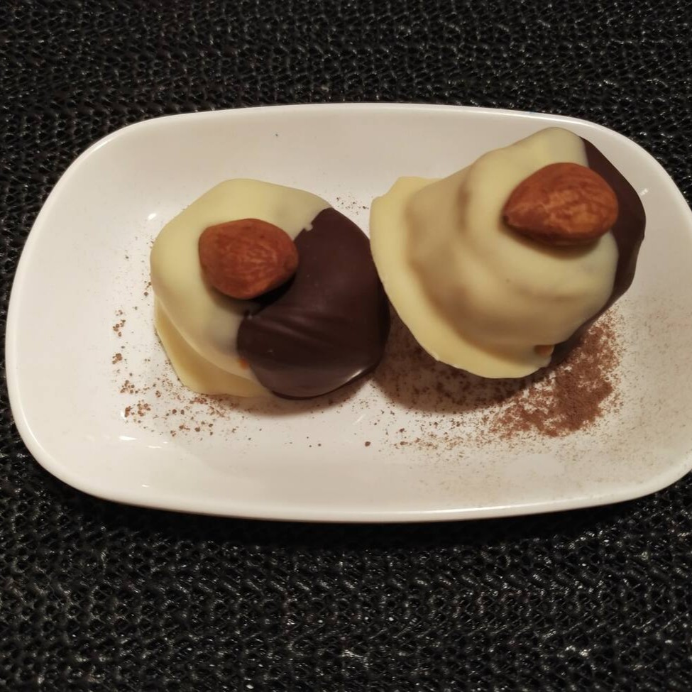 Bombom damasco especial um clássico da munik, vem com o damasco inteiro por dentro, em cima doce de leite e coberto com os dois tipos de chocolate ao e branco e por cima de tudo vem uma amêndoa. (100g