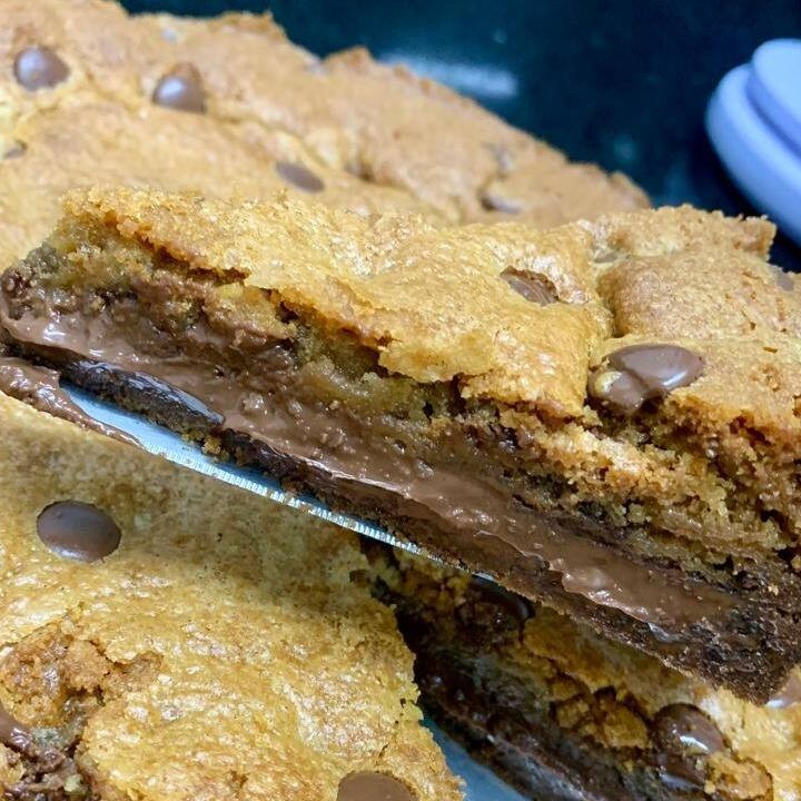1 fatia de torta cookie com gotas de chocolate recheada com Nutella.