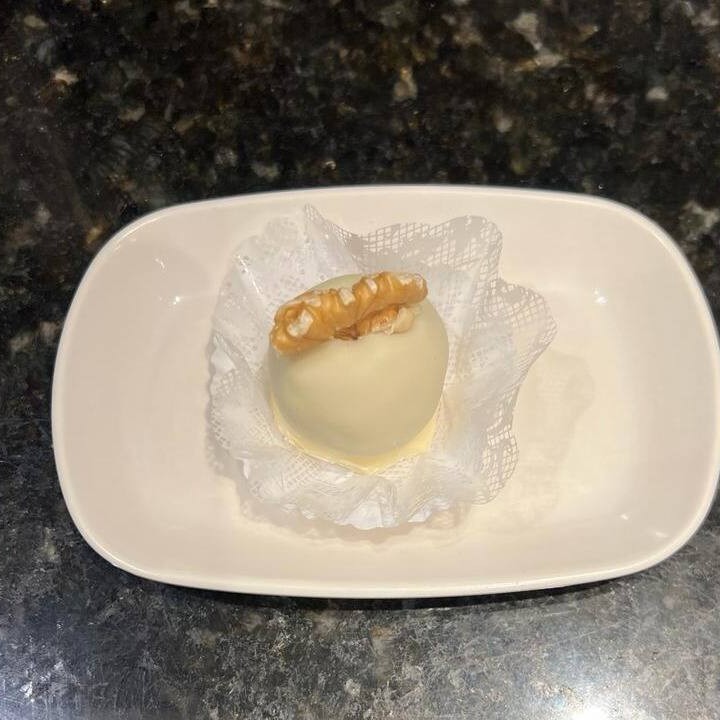 Docinho com massa de nozes coberto com chocolate branco, glaceado e é decorado com uma ¼ de noz