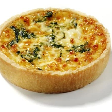 Massa brisée preparada com farinha de trigo, com baixo teor de gordura , recheada com delicioso refogado de espinafre, queijo prato, complementado com creme de leite, ovos e noz moscada.