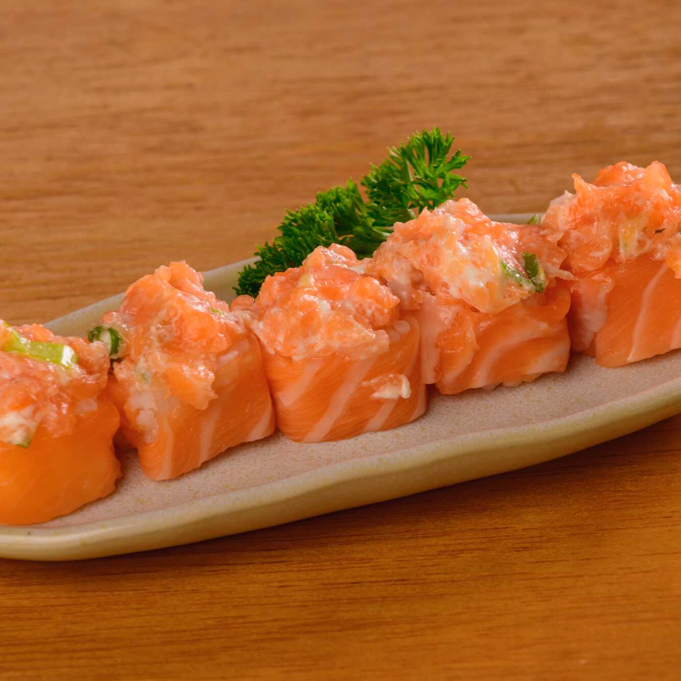 O requintado Sushi Jhou todo lindão. Essa é uma mini porção de 5 peças de Sushi de Salmão salpicado com cebolinha e cream cheese que cabe no seu bolso. Uma delícia, minha gente.