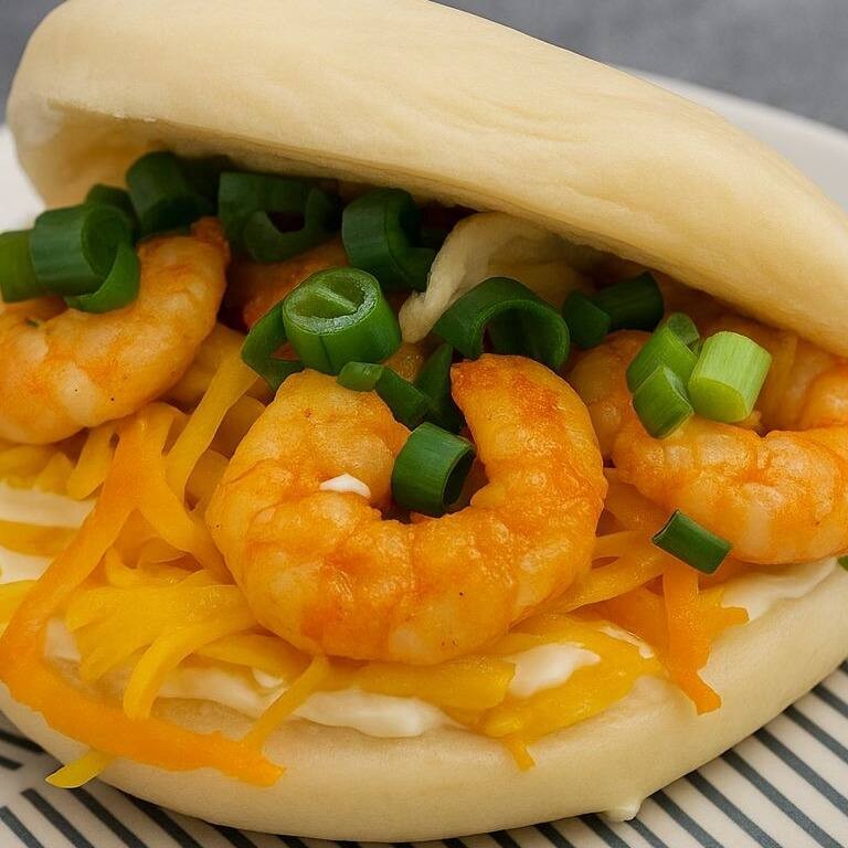 Sandubinha com pão chinês, camarão, cream cheese e cebolinha.