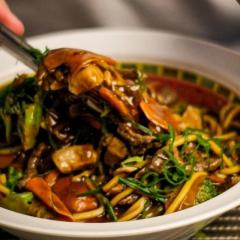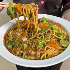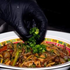 Delicioso Macarrão oriental com tiras de carne bovina, legumes e molho oriental. O mais vendido! Porção grande de 1,100kg serve de 2 a 3 pessoas. Porção pequena 750gr serve de 1 a 2 pessoas.