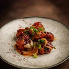 Sobrecoxa de frango bem temperada, suculenta e envolvida no clássico molho agridoce. Acompanhada de cebola refogada e cebolinha fresca, é a porção perfeita para dividir ou se deliciar sozinho.