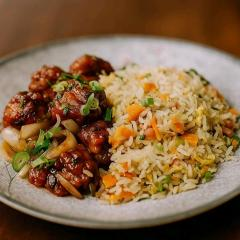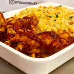 Sobrecoxas de frango salteadas no clássico molho agridoce, com cebola e cebolinha que realçam o sabor. Servido junto ao yakimeshi, feito com arroz, ovos e legumes na chapa, para uma combinação completa e irresistível.