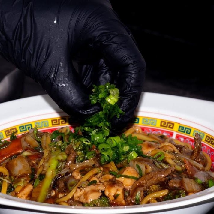 Delicioso macarrão oriental refogado no wok com acelga, cenoura ,brócolis. Tiras de carne,cubos de frango, envolvidos no molho oriental da casa . Finalizados com cebolinha. 4kg de yakissoba serve de 5 a 6 pessoas.