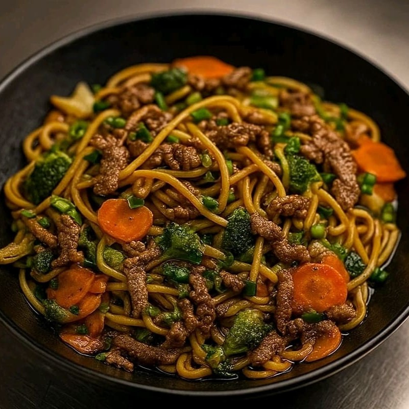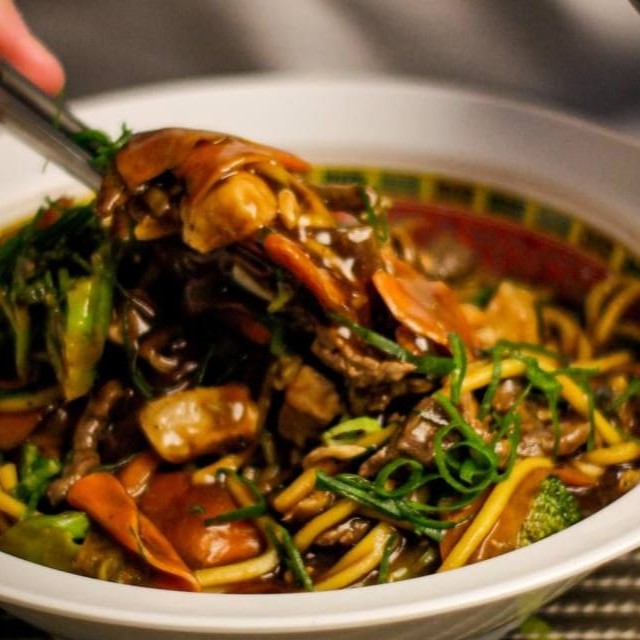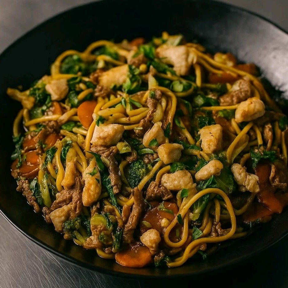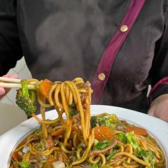 Delicioso macarrão oriental salteado no wok com acelga ,cenoura e brócolis, carne bovina e frango. Finalizado com o molho especial da casa e cebolinha.