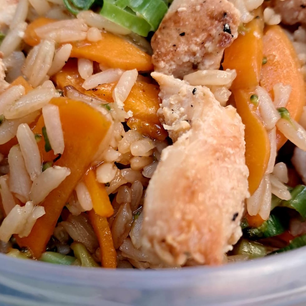 Arroz, brócolis,cenoura, cebolinha e cubos de frango.