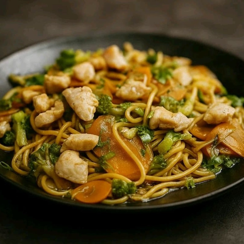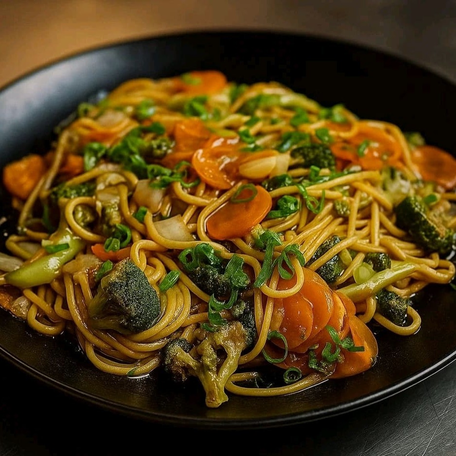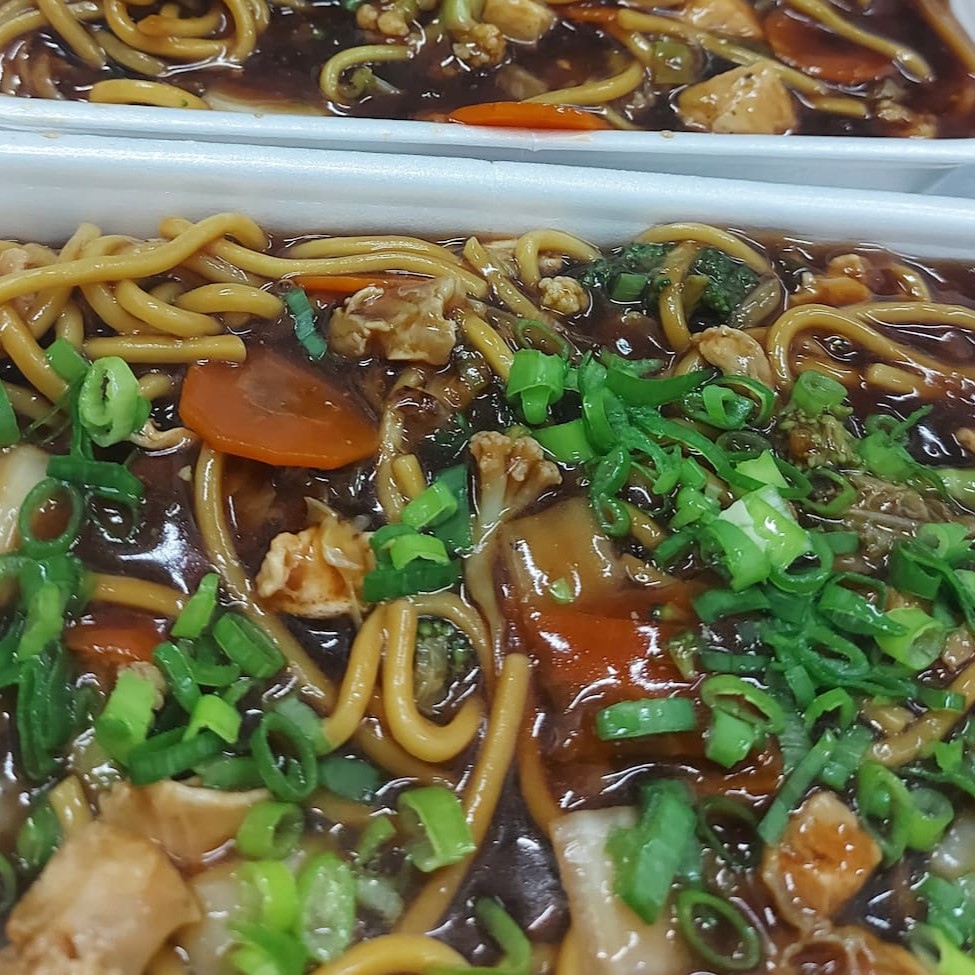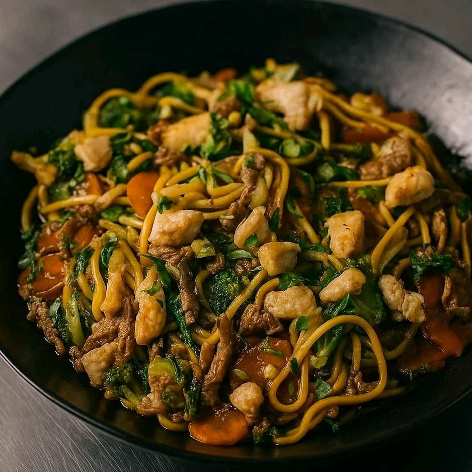 Delicioso macarrão oriental salteado no wok com acelga ,cenoura brócolis,carne e frango. Finalizado com o molho especial da casa e cebolinha.