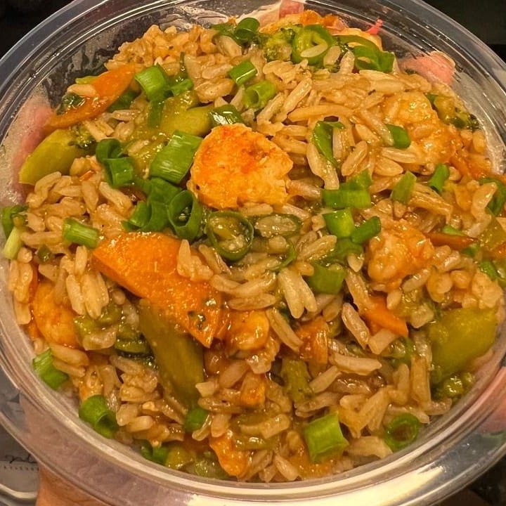 Arroz, brócolis,cenoura, cebolinha e camarões.
