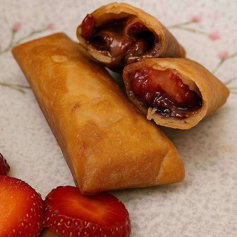Massa frita ,fininha crocante, recheio cremoso de chocolate com morango.