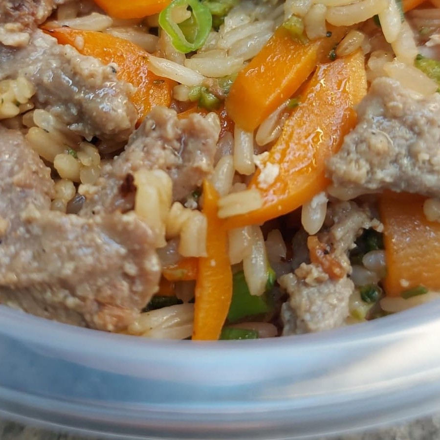 Arroz, brócolis,cenoura, cebolinha e tiras de carne. (400gr)