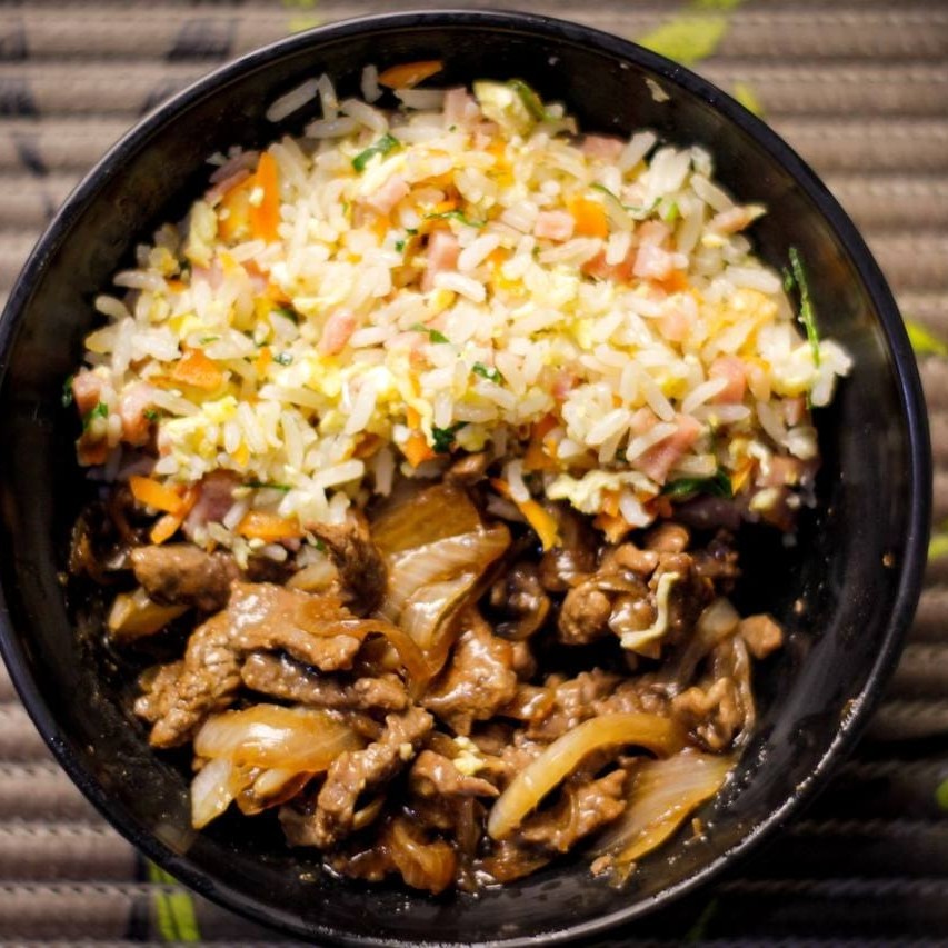 Carne em tiras com cebola, temperados com molho de soja, acompanha arroz tipo yakimeshi. Porção grande são 2 marmitas,serve 2 a 3 pessoas
