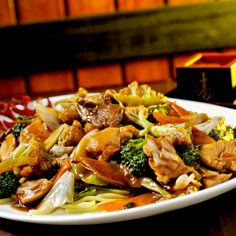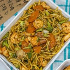 Delicioso Macarrão oriental, legumes, carne bovina, peito de frango, camarão e molho oriental especial.