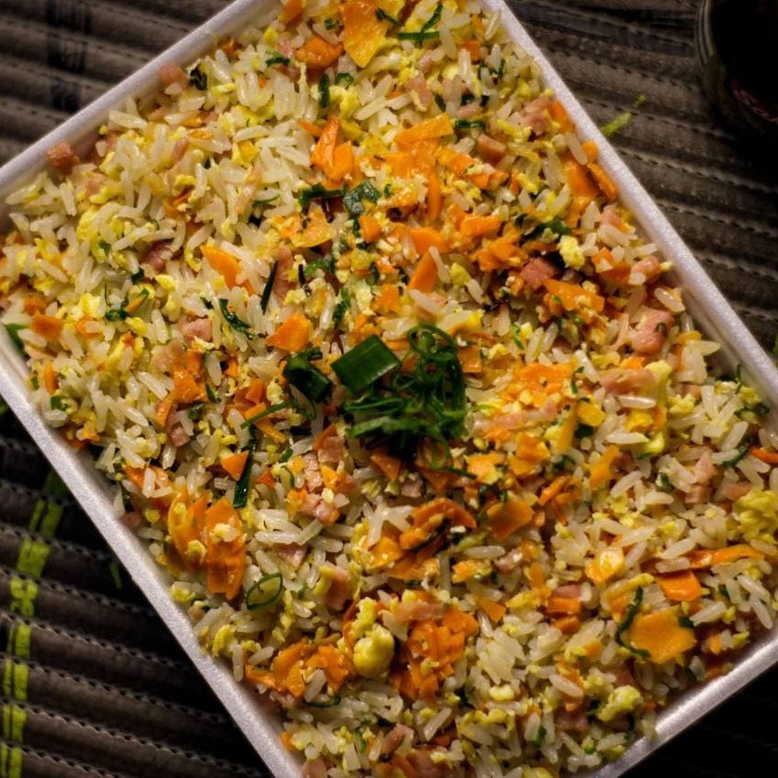 Arroz tradicional com flocos de ovo, cenoura, apresuntado e cebolinha picada.
