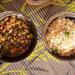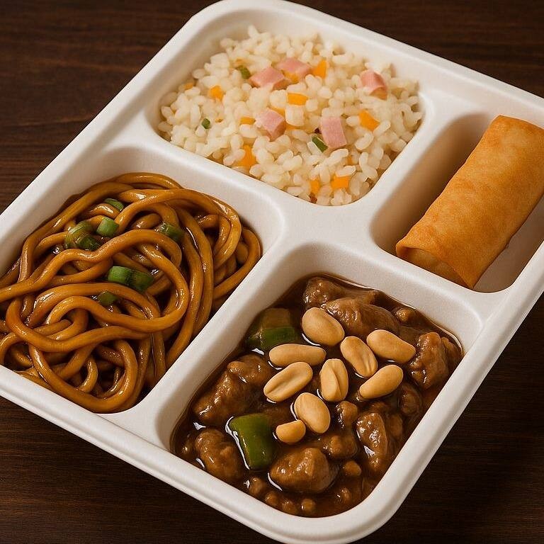 Frango xadrez, yakimeshi, Yakissoba e 1 rolinho doce de sobremesa.serve 1 pessoa. Aprox. 400gr