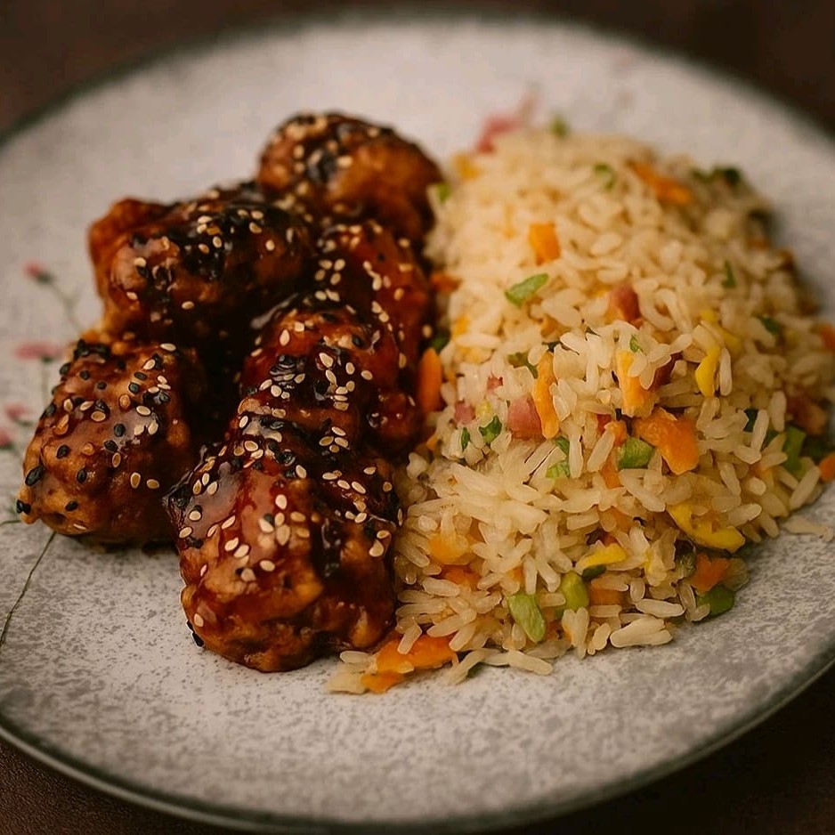 O karaage levemente adocicado combina frango crocante com uma marinada suave de molho especial, criando um contraste delicioso de sabores. Ao lado, o yakimeshi é um arroz frito macio, preparado com presunto, ovo, cenoura e cebolinha, trazendo um sabor suave e equilibrado. Juntos, formam uma combinação perfeita de texturas e sabores, do salgado e crocante ao leve e aromático.
