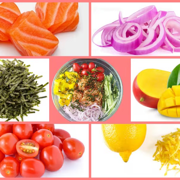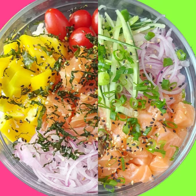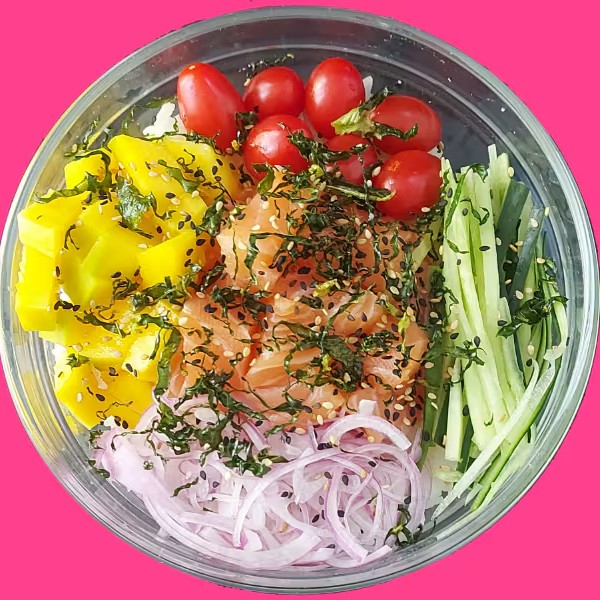 Este delicioso Poke contém em sua base 200g de Arroz Shari, 100g de Salmão fresco em cubos, tiras de pepino, cebola roxa, Tomate Cereja, Manga em cubos, couve Crispy e Gergelim