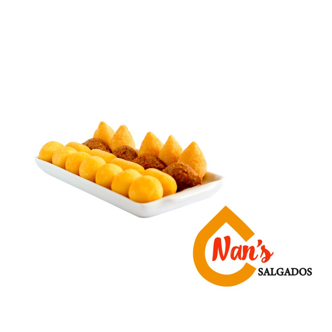 Mix de coxinha de frango, risole de presunto e queijo, bolinho de queijo, bolinho de carne, bolinho de calabresa, bolinho de calabresa com queijo e kibe