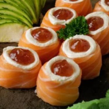 Enrolado de arroz por fora, recheado com salmão e cream cheese por dentro.