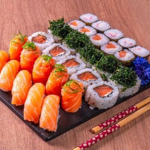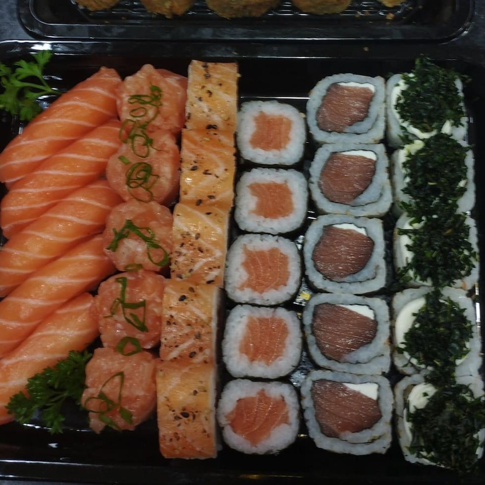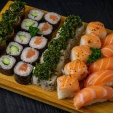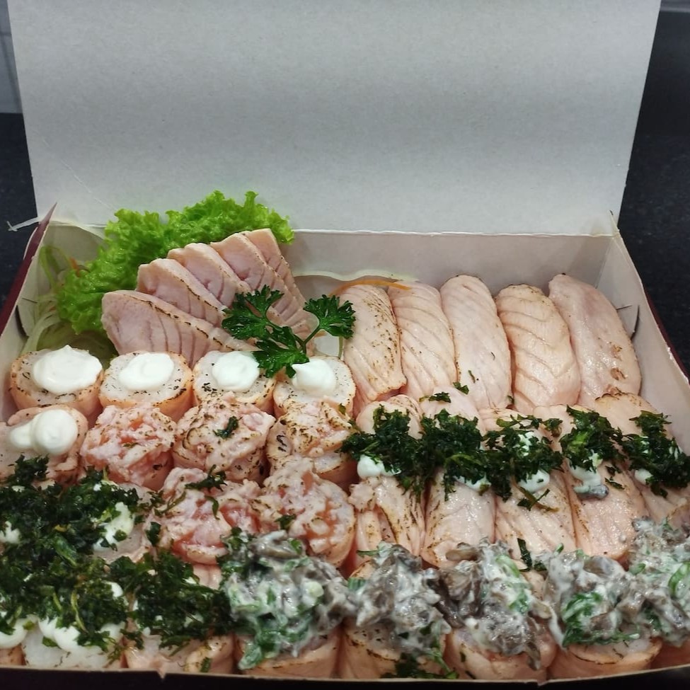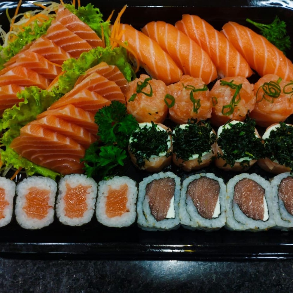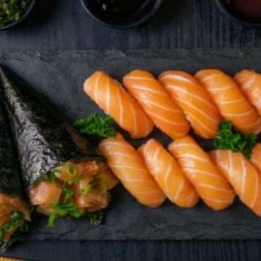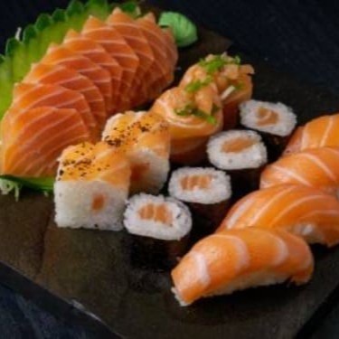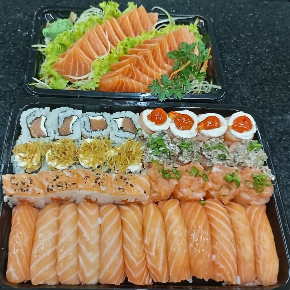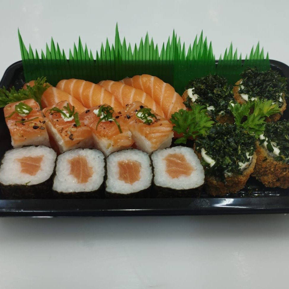 1 temaki a sua escolha, 6 sashimis salmão, 2 jou salmão, 2 niguiri salmão, 2 hossomaki salmão, 2 baterá salmão e 2 hot couve. Obs: sem alterações de itens.