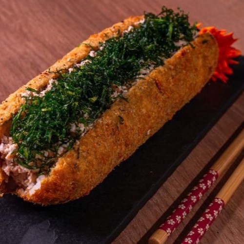 Hot Holl empanado, com recheio de salmão grelhado, creme cheese, cebolinha, gergelim, e couve.