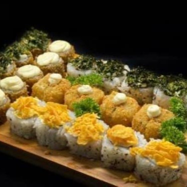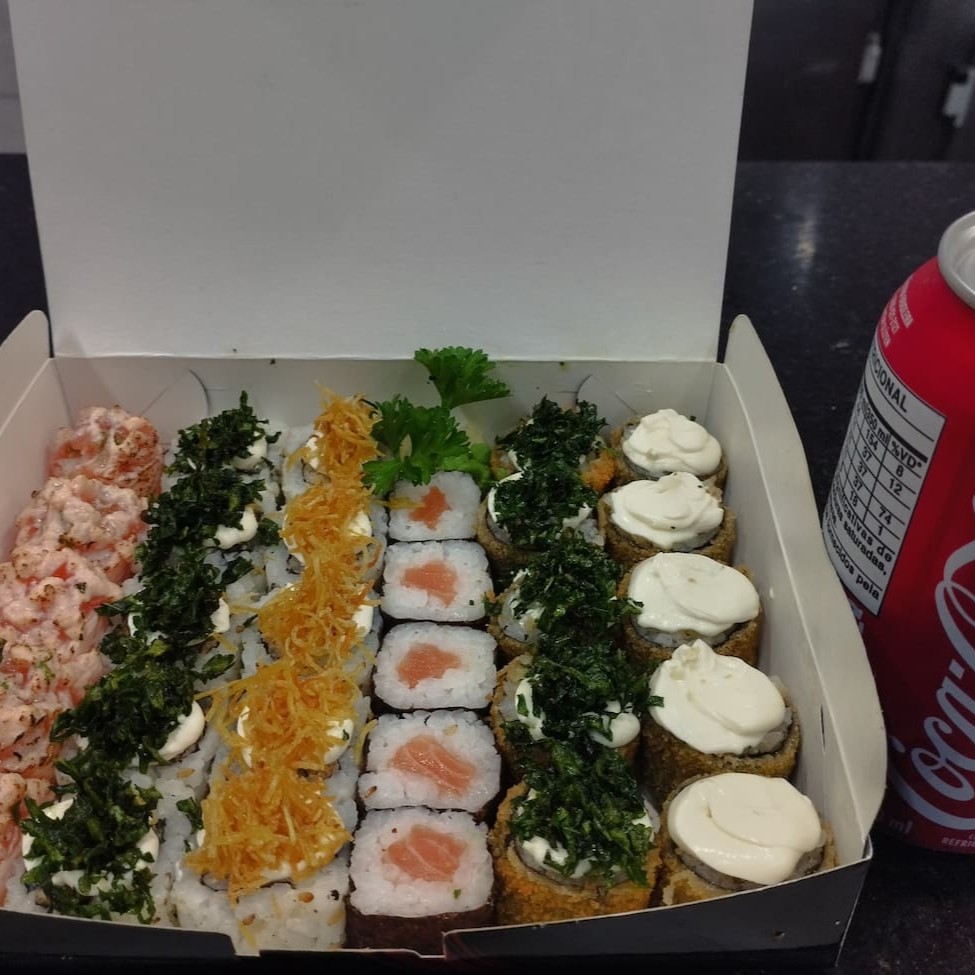 **Combo Sensação Gold - Nada Cru (65 peças)** Um combo exclusivo e irresistível para os amantes da boa comida japonesa: - **35 Uramakis de Salmão Grelhado** com um toque especial do nosso topping exclusivo da casa. - **30 Hot Rolls Variados**, todos finalizados com nosso topping exclusivo, que dá aquele sabor único e marcante. **Bônus:** Ganhe **uma Coca-Cola lata grátis** para acompan