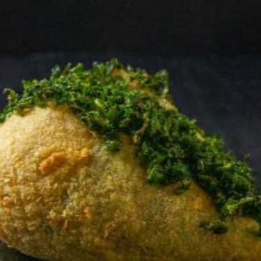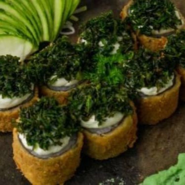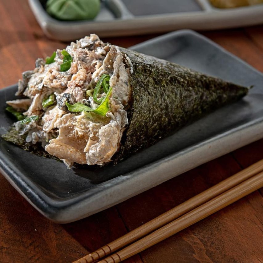 Temaki empanado na farinha panko, recheado com salmão grelhado, cream cheese e couve crispy.