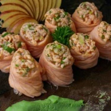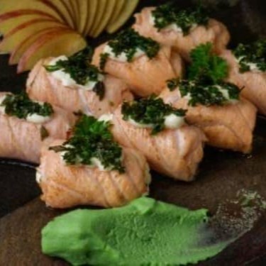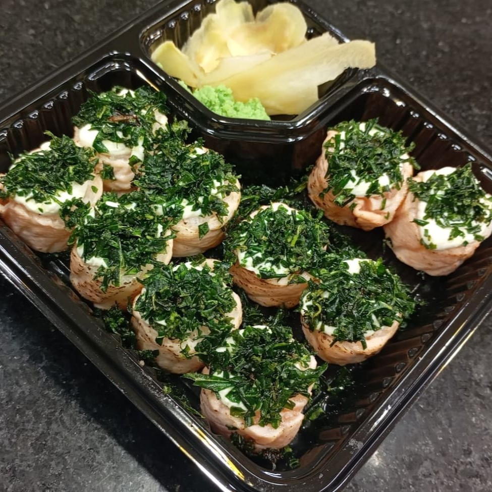 Enrolado de salmão maçaricado sem arroz recheado com cream cheese por dentro e couve cryspe cim cima.