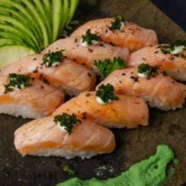 Experimente o delicioso 'Sushi do Cheff - 8 unidades', um destaque na nossa categoria de 'Entradas'. Este prato sofisticado apresenta Nigiri de salmão flambado, suculento e saboroso, harmoniosamente combinado com a suavidade do cream cheese. A cobertura de couve-crisp dá a crocância perfeita e o molho tarê, com seu sabor levemente adocicado, finaliza o sushi com maestria, proporcionando uma experi