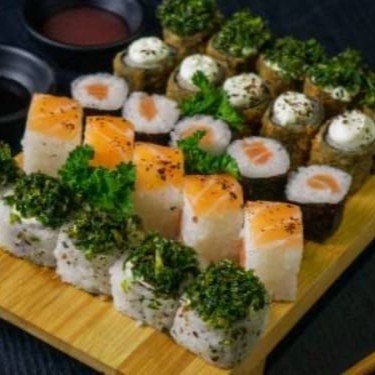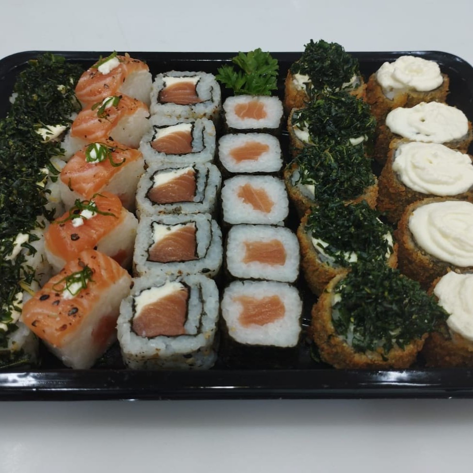 **Descrição do Combo So Sushi – 40 Peças** - **5 Uramaki Skin**: Arroz temperado e alga nori recheados com pele de salmão crocante e sabor marcante. - **5 Uramaki Salmão**: Enrolado tradicional com salmão fresco e textura suculenta que derrete na boca. - **5 Uramaki Filadélfia**: Combinação irresistível de salmão com cream cheese cremoso. - **10 Salmãomaki**: Mini rolinhos com salmão puro