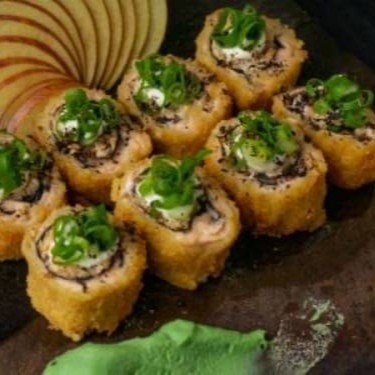 Sushi empanado na farinha panko, recheado com salmão grelhado, e cream cheese por cima e tarê.