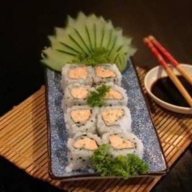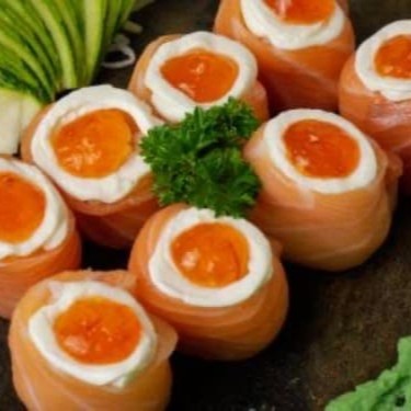 Enrolado de arroz por fora, recheado com salmão e cream cheese por dentro.
