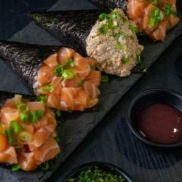 2 temaki de salmão completo, 10 niguirí salmão e 4 uramaki skin couve. Acompanha shoyo, hashi e tarê.