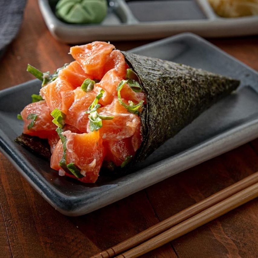 Enrolado com alga por fora, recheado com salmão por dentro.