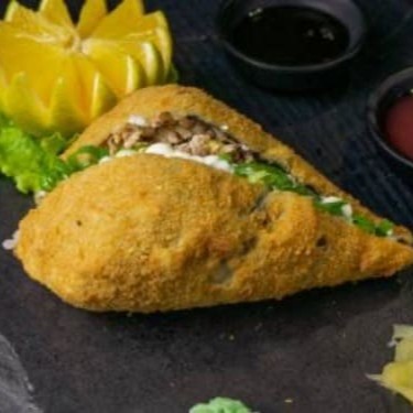 Temaki empanado na farinha panko, recheado com salmão grelhado, cream cheese e couve crispy.