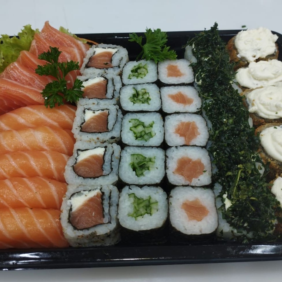 16 sashimis de salmão, 6 niguiris salmão, 4 joe salmão, 4 hossomaki, 3 hot couve cryspe e 3 baterá. Acompanha shoyo, hashi e tarê.