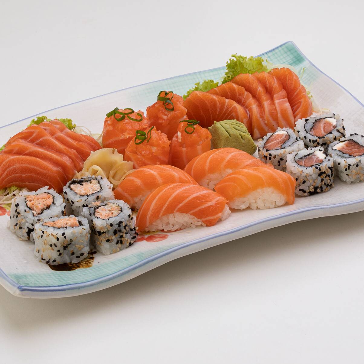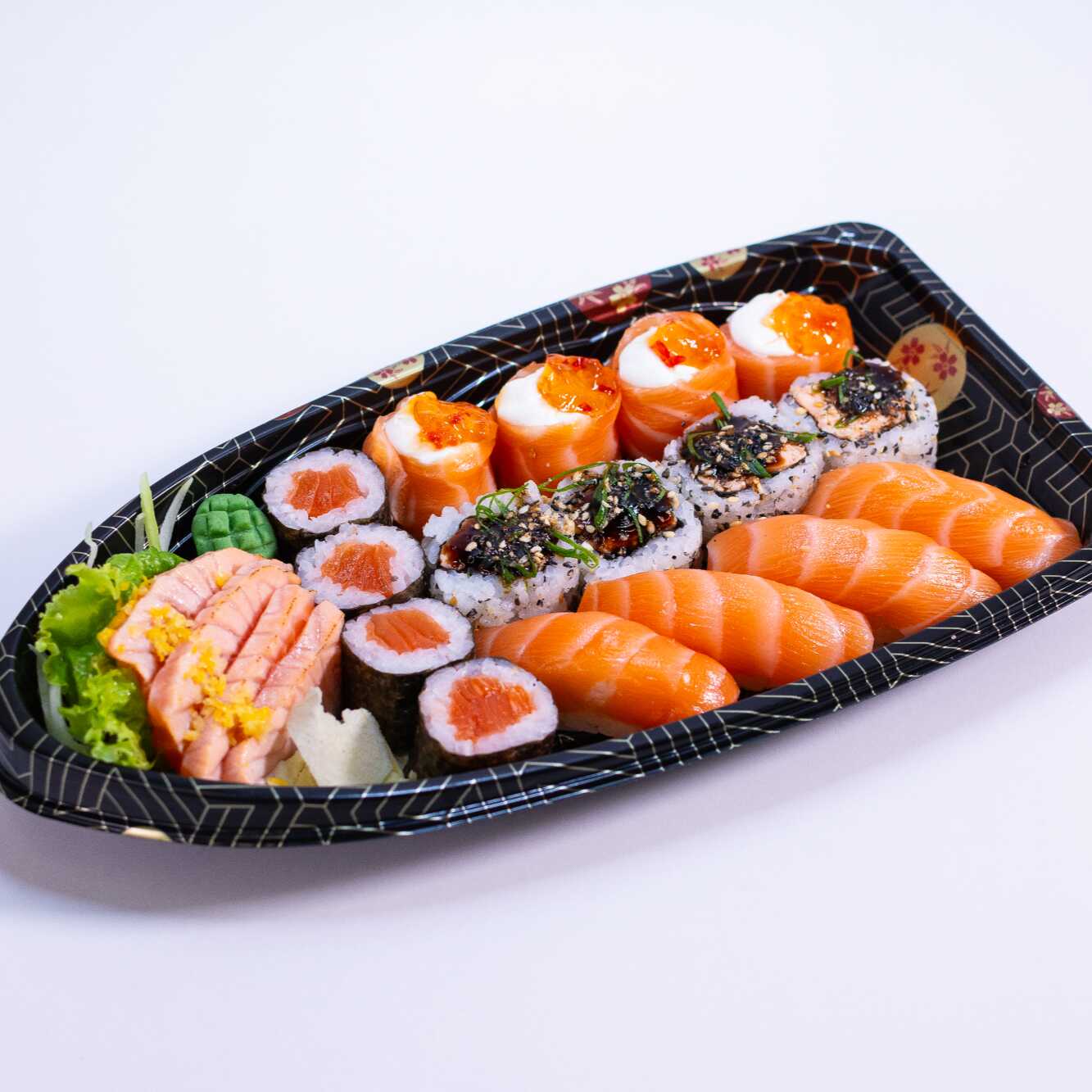 520g (26 peças) - 10 Sushimis de Salmão; 4 Niguiris de Salmão, 4 Uramakis de Salmão, 4 Jow e 4 Uramaki Skin.