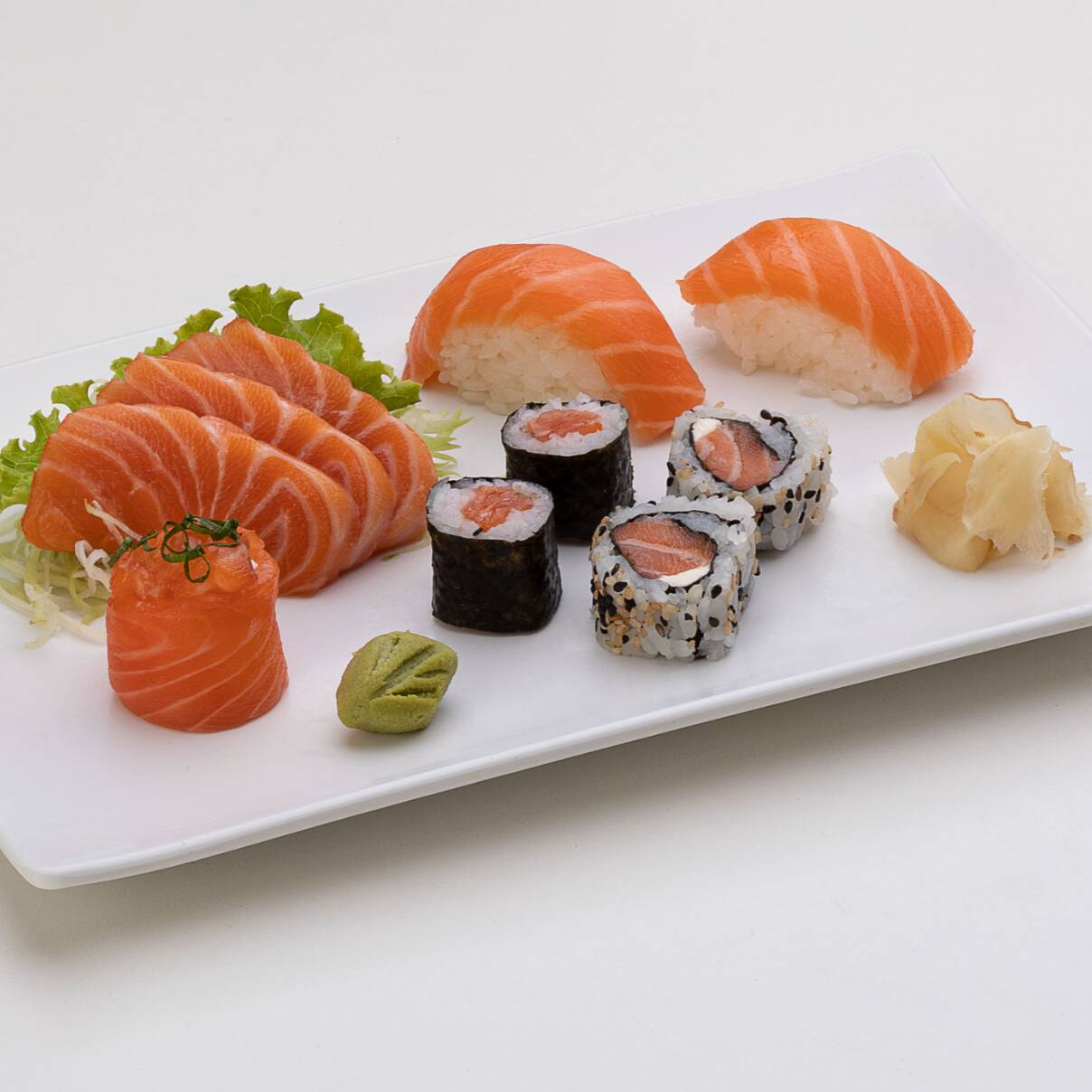 180g (10 peças) - 3 sashimis de salmão, 2 niguiris de salmão, 2 sakemakis, 2 uramakis e 1 jow