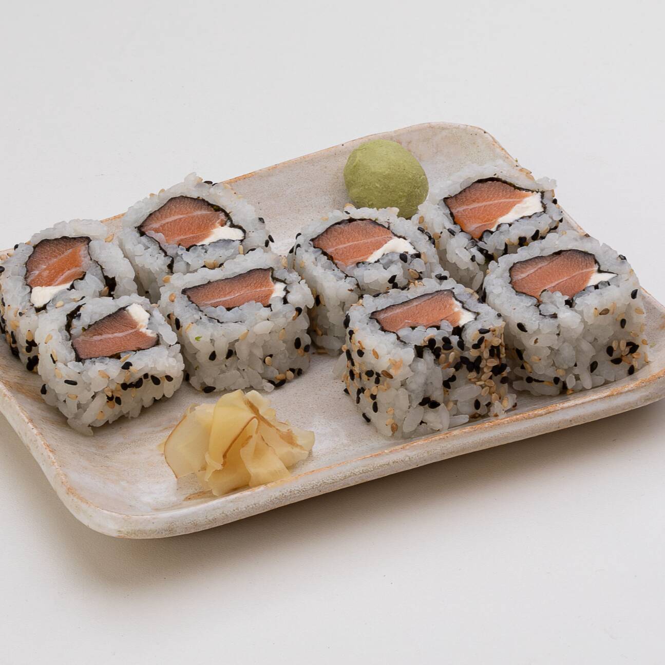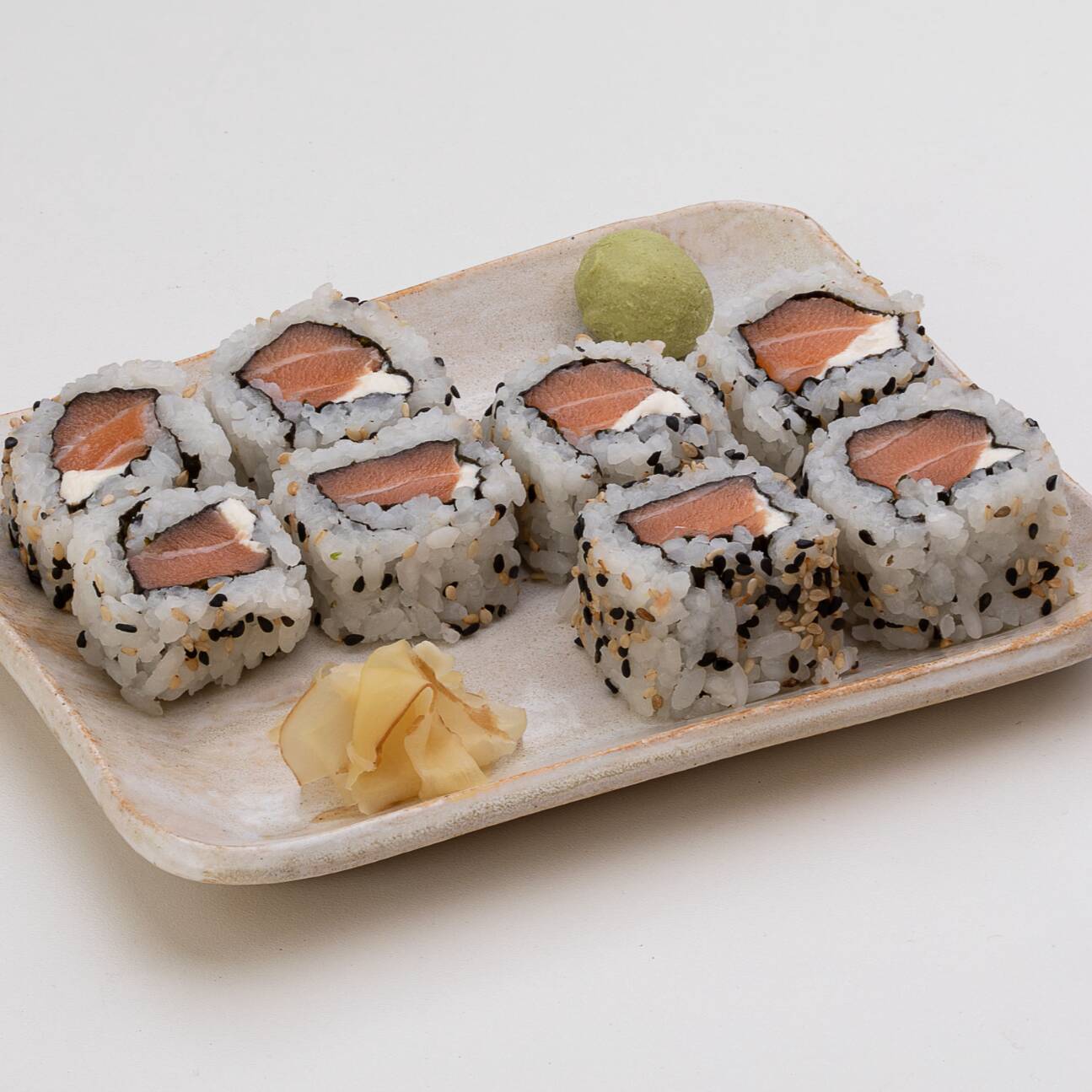 190g (8 peças) - Arroz Japonês Cozido, Salmão, Cream Cheese, Gari, Alga, Cebolinha, Gergelim Branco e Preto e Wassabi.
