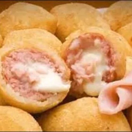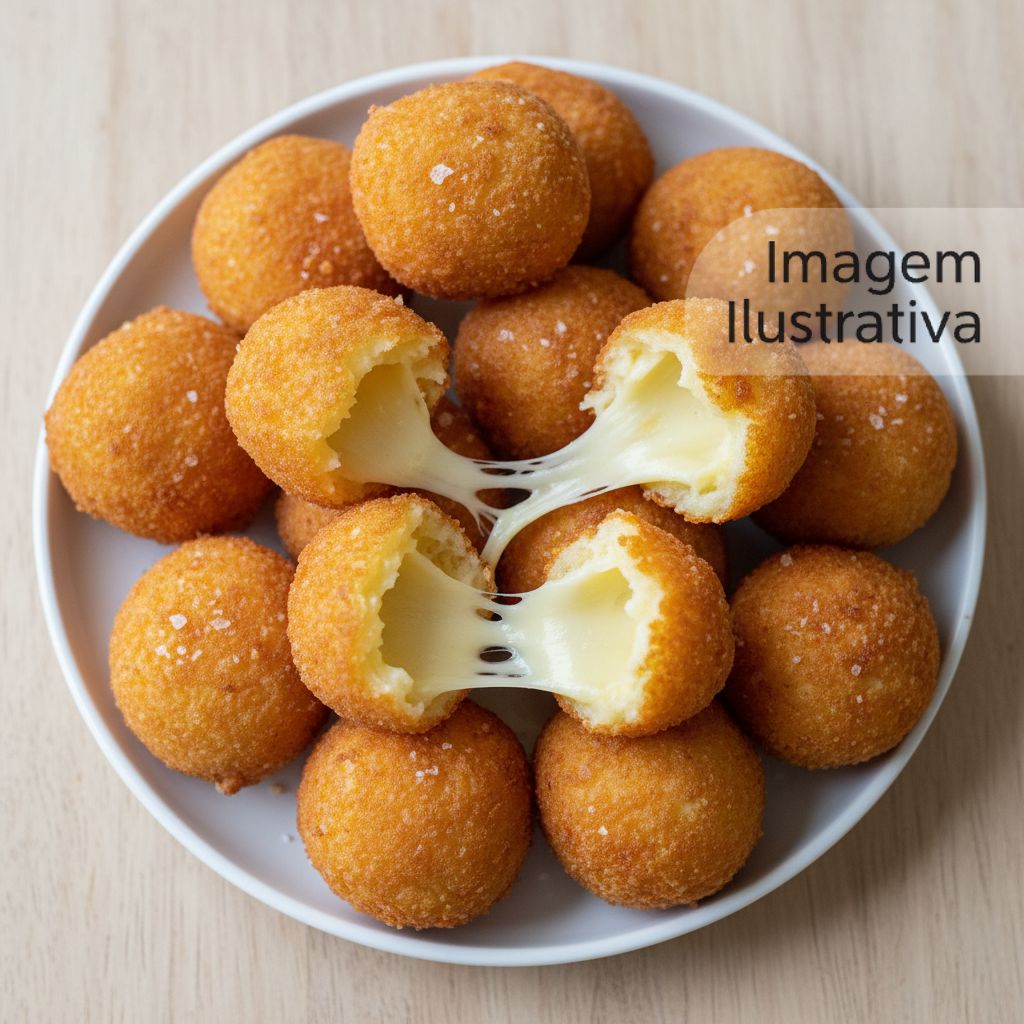 Delicioso bolinho frito recheado com queijo derretido. Perfeito para um lanche rápido e saboroso.