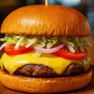 Pão brioche, Maionese da casa,um Burger de Wagyu com 165g, American cheese, alface, tomate, cebola roxa e picles.