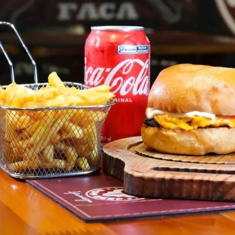 Pão de brioche, Maionese da Casa, burguer 165g e american cheese 100 grs de Batata Frita Refrigerante - Coca cola