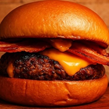 Pão de brioche, maionese da casa, burguer 165g, cheddar e bacon.