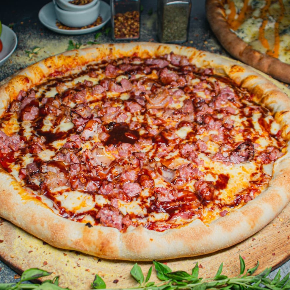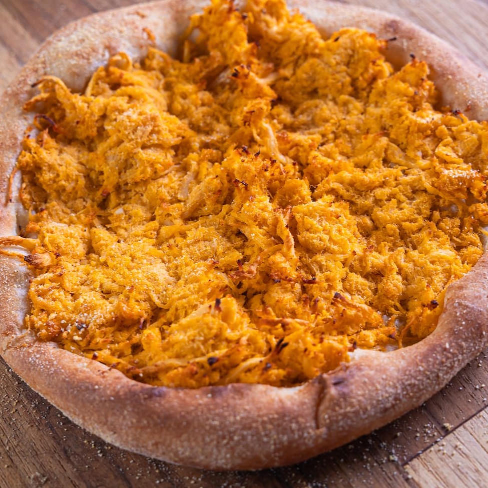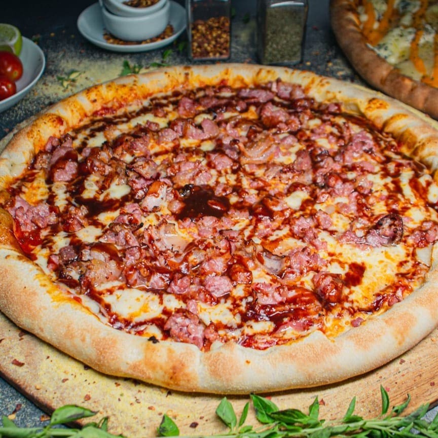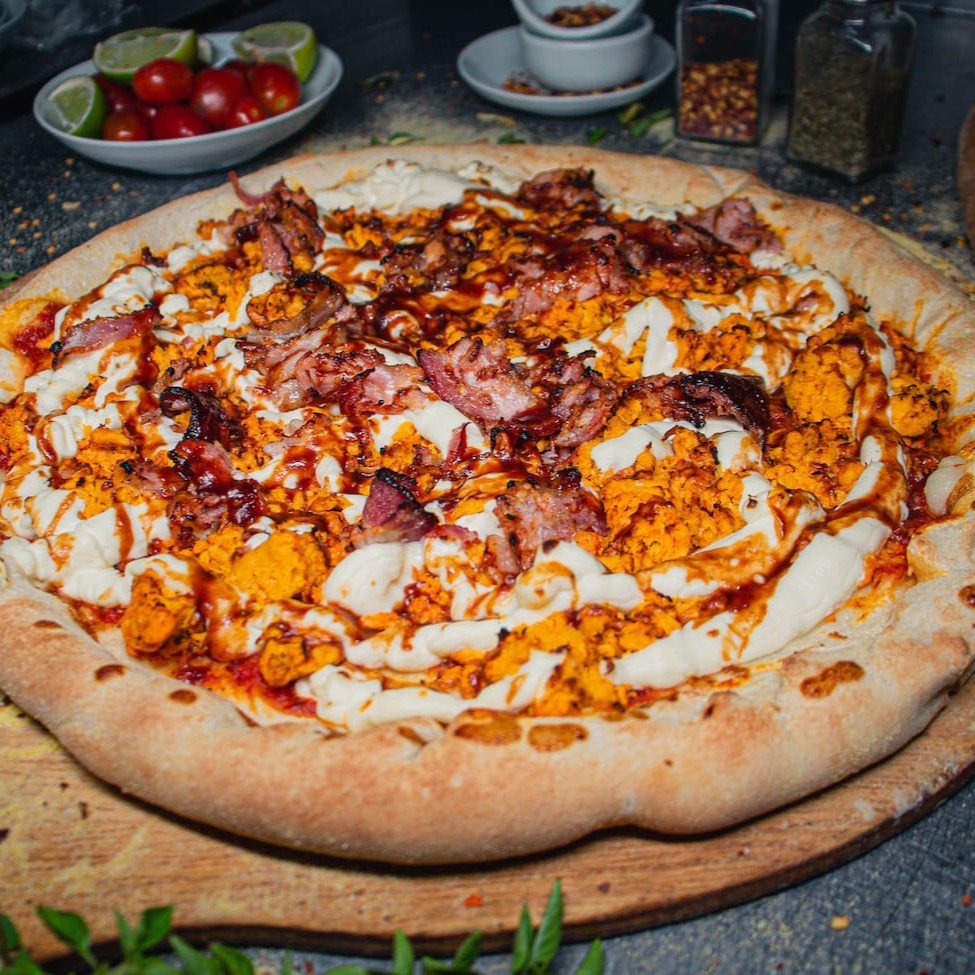 Pizza composta por: Frango, cream cheese, molho barbecue e bacon. Uma deliciosa sensação de sabores!