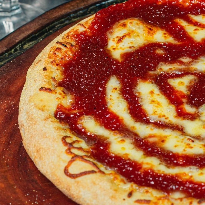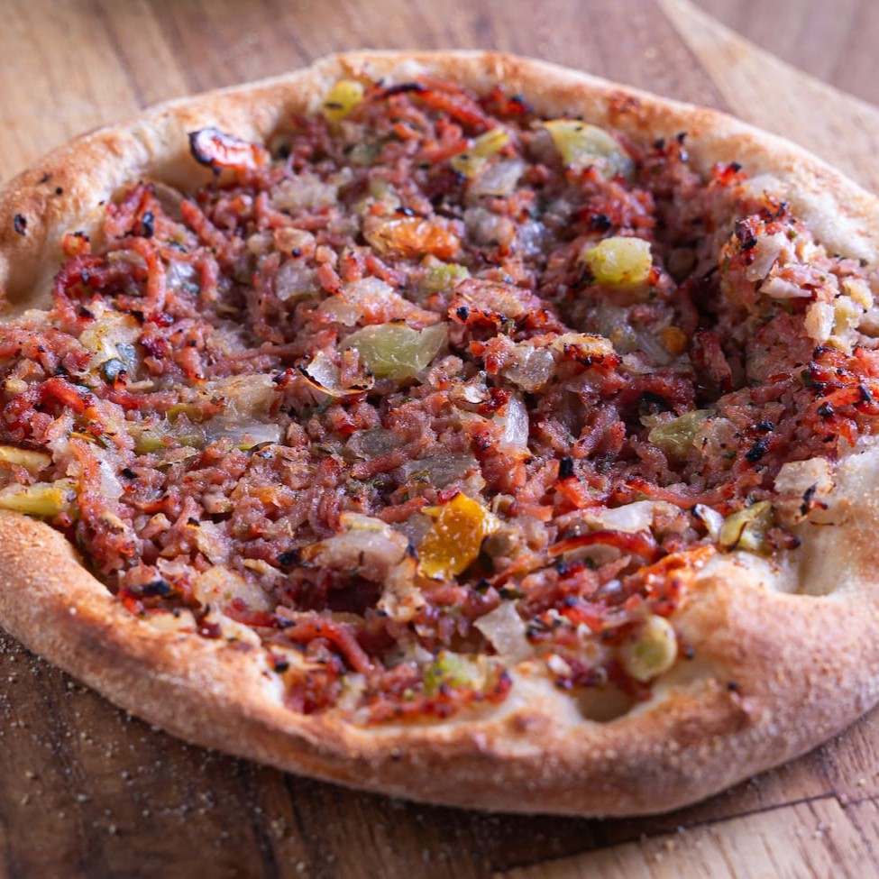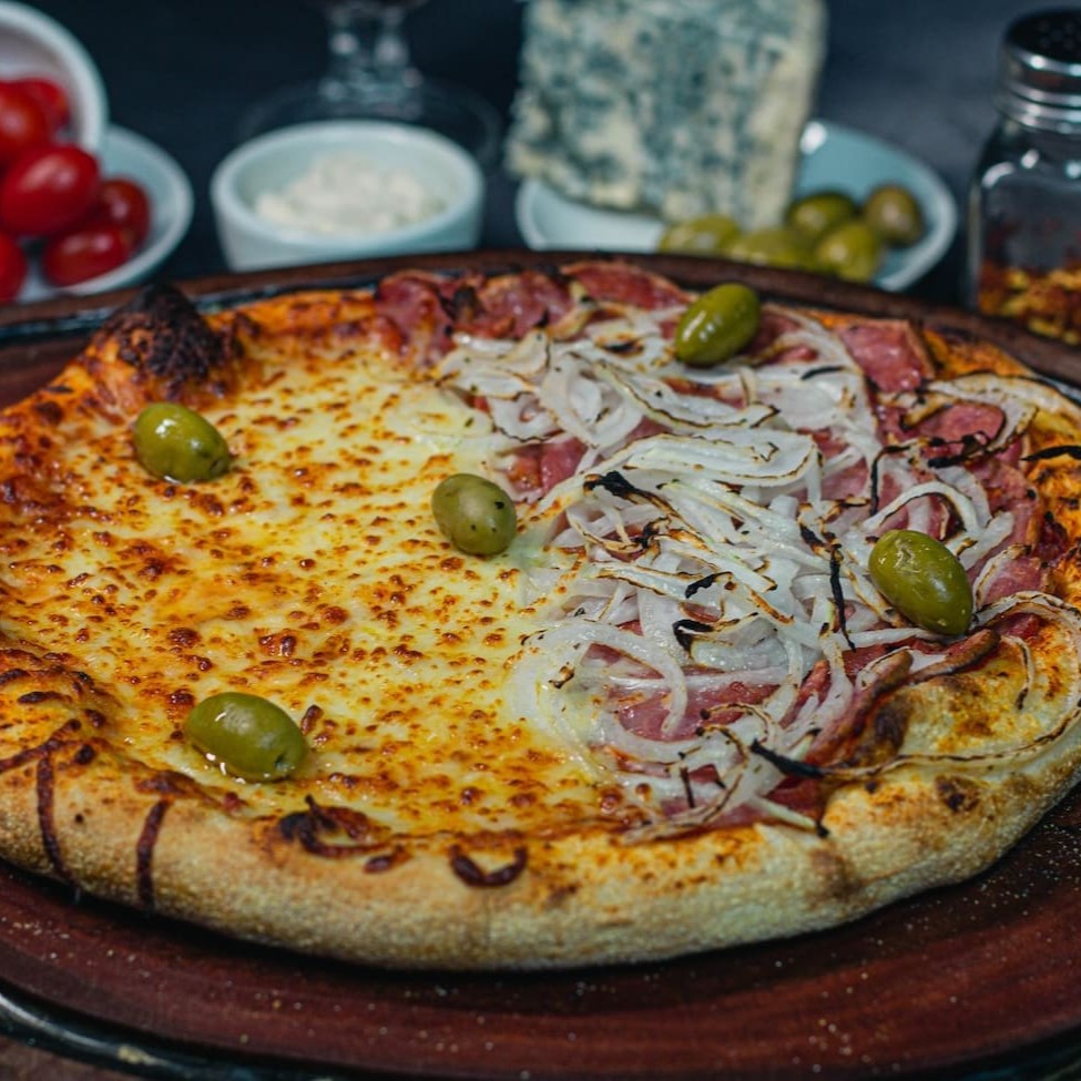 massa de longa fermetação, calabresa acebolada e mussarela