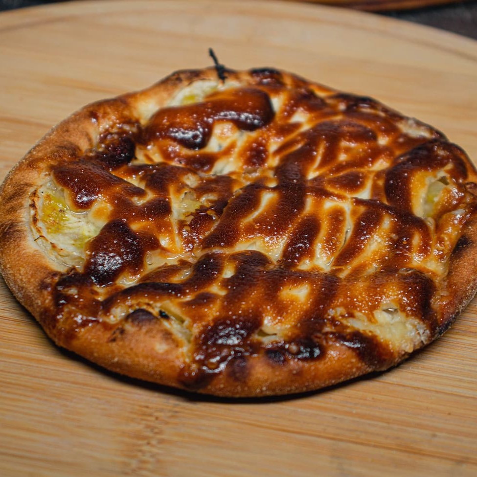 Deliciosa Esfiha composta por: Pernil refogado, Muçarela e molho barbecue.