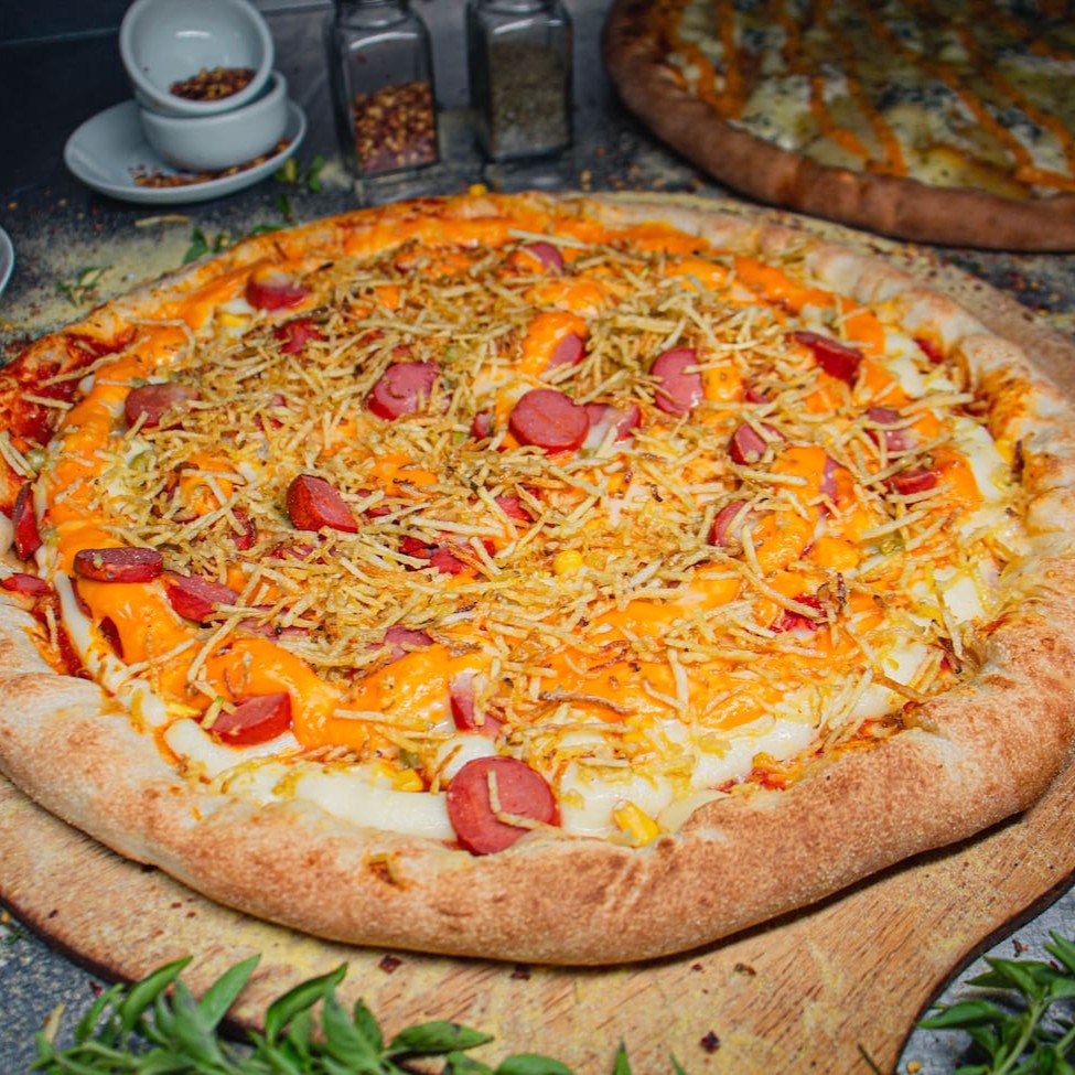 "Pizza composta por: Catupiry (Original), queijo cheddar, milho, ervilha, Muçarela, salsicha e batata palha! Um verdadeiro ""Dogão"" em forma de pizza!"